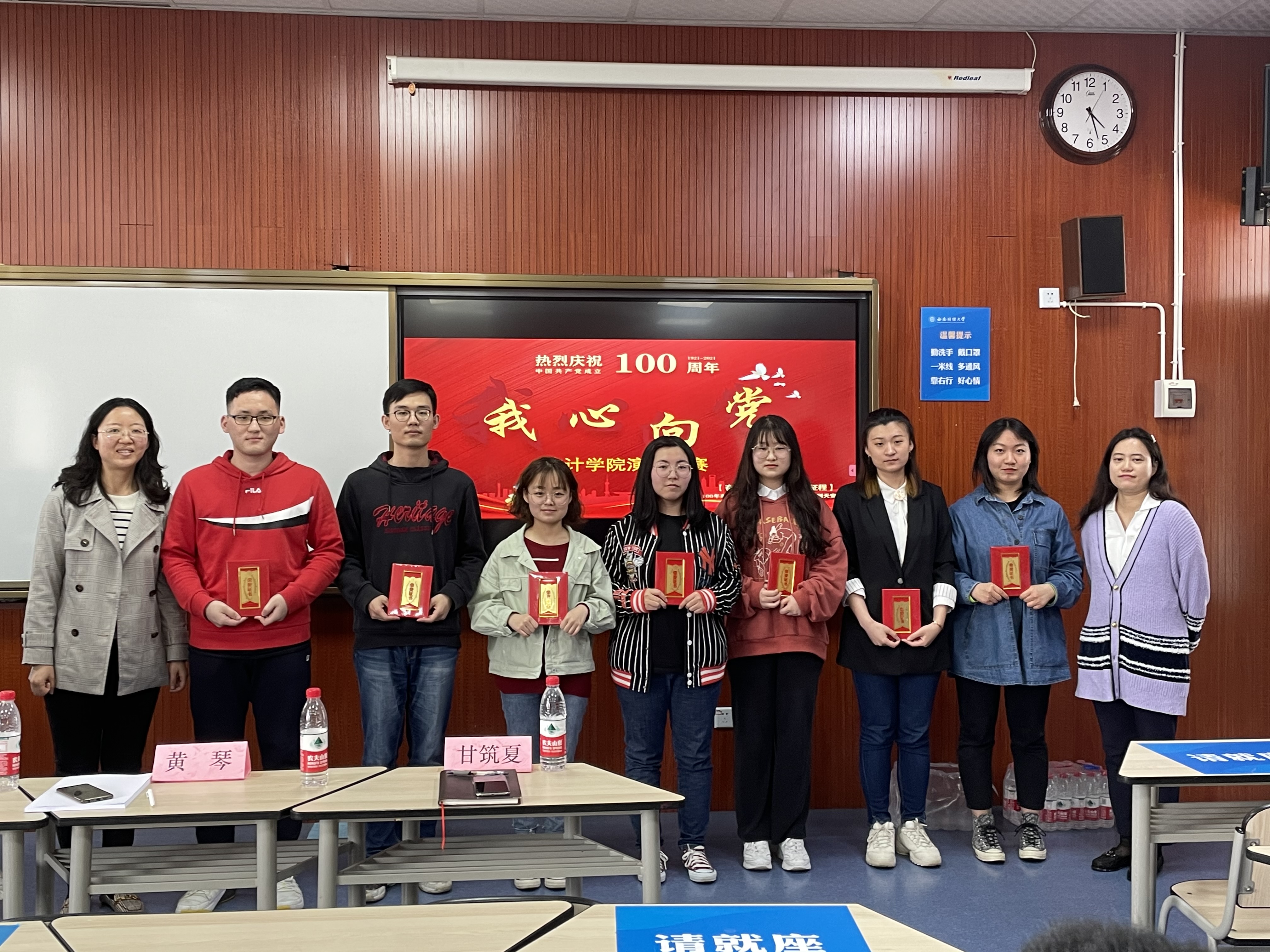 活动尾声,黄琴老师作了总结点评,她首先肯定了参赛同学们的精彩表现,并对同学们踊跃参加“我心向党”演讲比赛的行为深感欣慰,也指出了参赛同学在演讲比赛的亮点以及不足之处,并呼吁各位同学从党的历史中体会党的初心和使命,以此带动更多的人学习党史,传承革命精神,坚定理想信念。最后,老师们为获奖同学颁奖并合影留念。