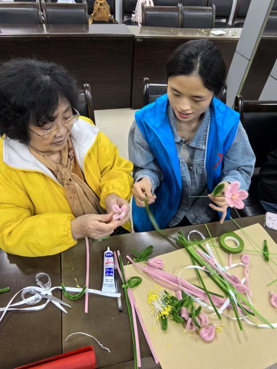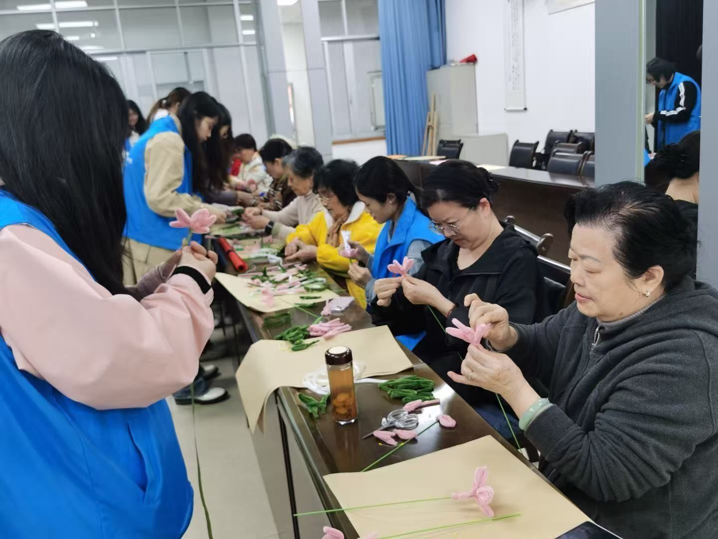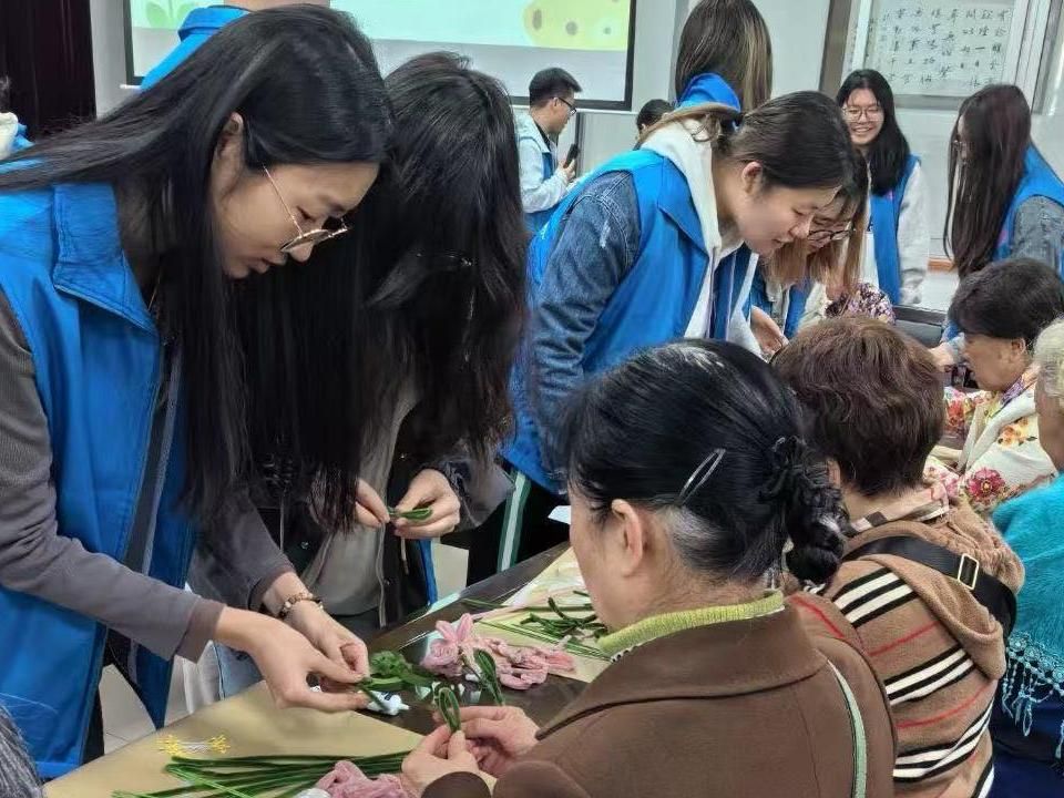 巧手生花组的志愿者们悉心教授扭扭棒海棠花制作技巧,一根根普通的绒棒在他们手中化作朵朵粉嫩娇艳的海棠,绽放出春日的生机;