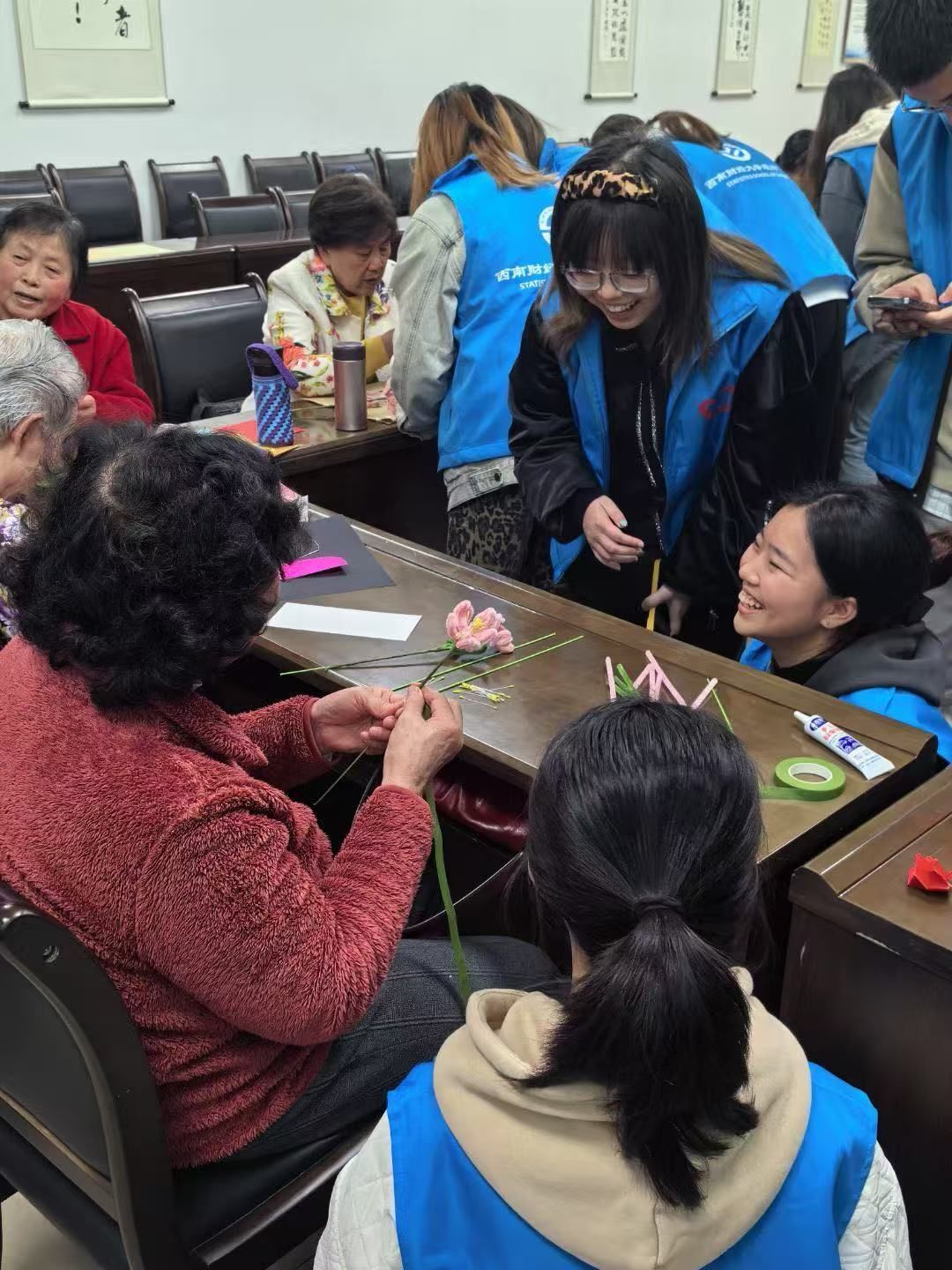 志工部于4月7日在光华校区离退休教职工活动中心成功举办了“老少携手,暖心光华”手工特别活动。此次活动旨在搭建代际沟通桥梁,通过创意手工互动促进青年学子与离退休教职工的情感交融,让年轻一代在实践体验与交流中深刻感悟西财百年校庆的主题内涵。活动现场,西财人齐聚一堂,在扭扭棒、书签等丰富多彩的手工创作中共话校史、畅想未来,欢声笑语中洋溢着浓浓的温情与感动。