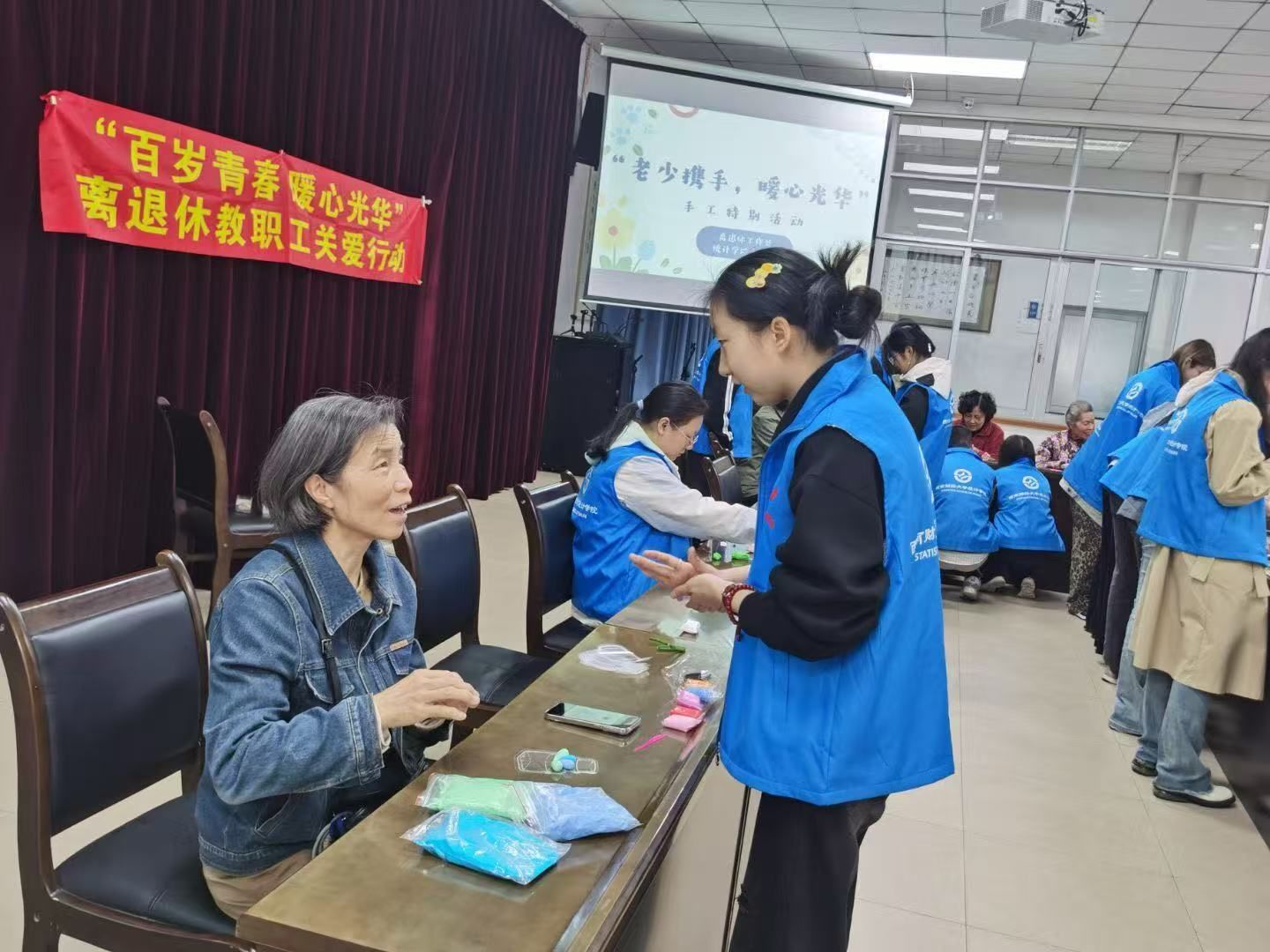活动现场,在志工部成员简洁而温馨的开场介绍后,一场充满创意与温情的手工创作盛宴正式拉开帷幕。志愿者们分组引导离退休教职工们体验丰富多彩的手工项目: