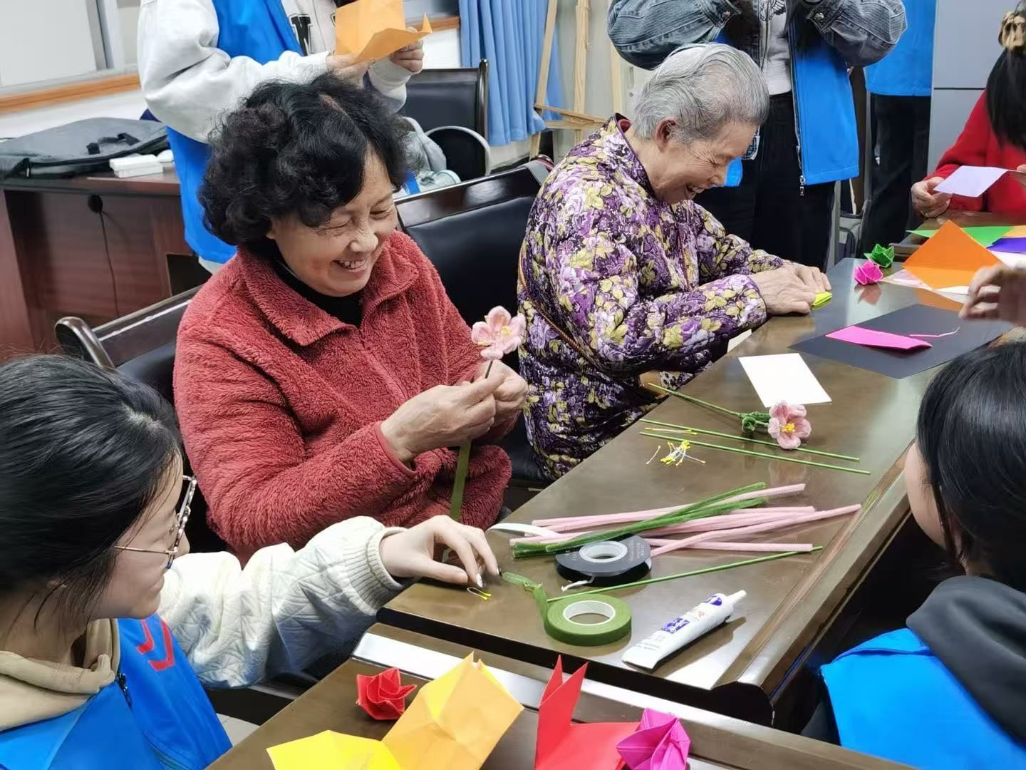 纸艺传情区,志愿者们正耐心示范折纸技法,只见彩纸在指间轻盈舞动,转眼间便幻化成栩栩如生的纸鹤、花朵等精美作品,引得在场众人连连赞叹。
