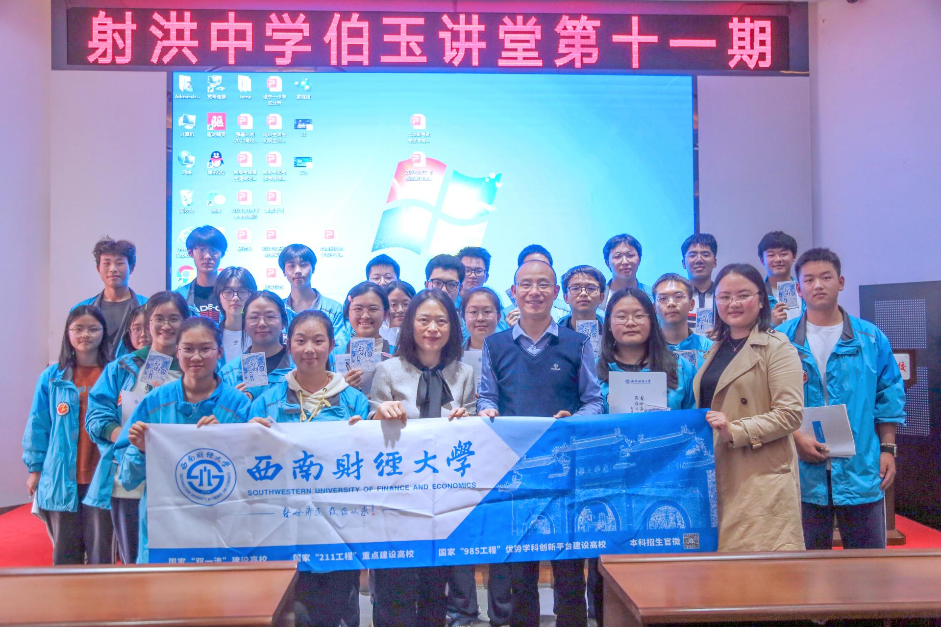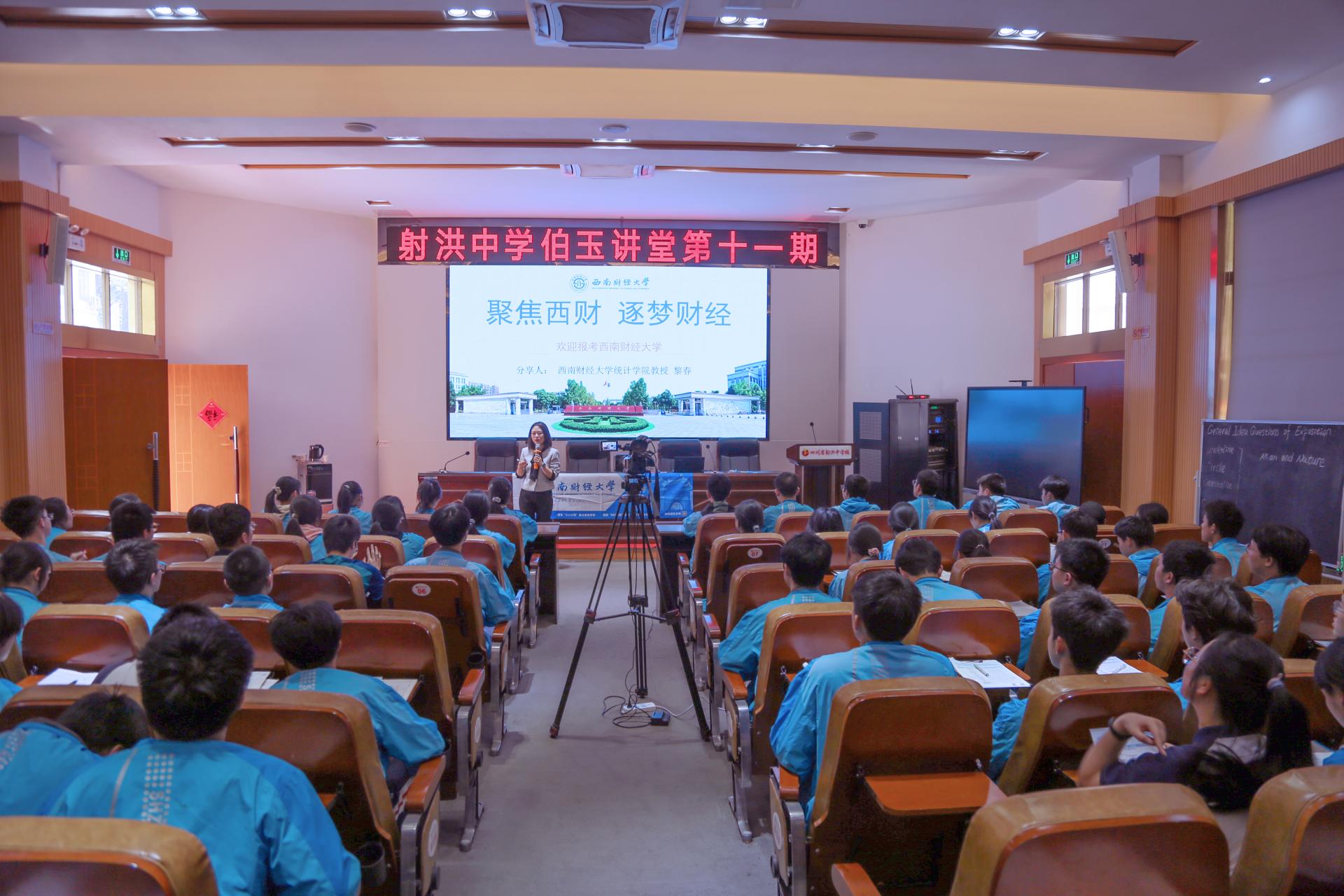 招生工作小组前往射洪中学,通过双线混合、网络直播的方式,面向线上线下5000余名高中部师生,开展“财经素养教育”讲座。