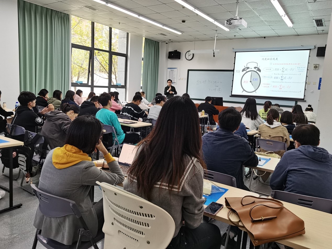 领导和教师的高度重视,本次观摩研讨活动主要目的为考察思政进课堂情况,共同提高思想政治教育与计量经济学本科课程的融合,进一步提高教学质量。本堂课程主要讲授计量经济学中线性回归模型的拟合优度检验相关内容。在授课中,李伊老师从多个角度深入阐释了拟合优度的概念,并用直观例子形象地给同学们解释,并将拟合优度与“量变引起质变”的哲学思想相结合,鼓励同学持之以恒追求真理,为国家建设做出贡献。课程观摩后,参加本次活动的领导及教师就思政进课程情况,以及课程内容安排,授课进度,与学生的互动及教学模式等方面进行了讨论与交流,并与课后学生进行了沟通。