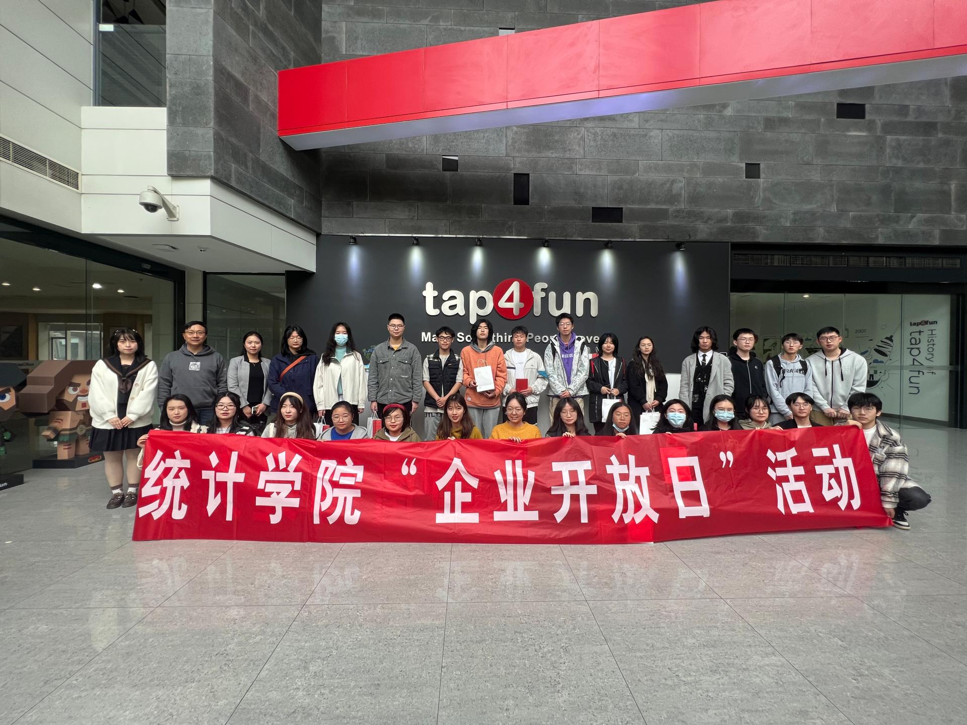 师生一行首先参观了企业办公环境,同学们第一次亲身感受到职场氛围。随后,企业HRBP任艺、数据分析部部长姬楠和实习生刘合天为到场师生带来了三场不同主题的分享:从tap4fun的狂人小说、发展历程、企业现状、校园招聘,到数据分析为游戏制作带来的优化、数据分析岗所需的专业技能,再到统计学子的实习经历和经验交流。最后互动环节,企业方耐心解答了师生对于企业人才需求、实际运用场景和发展前景等方面的问题。