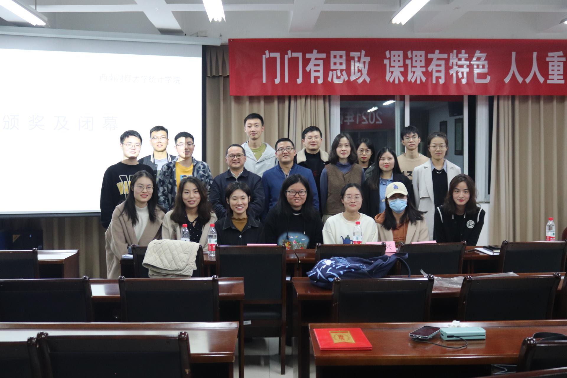 随后,答辩环节正式开始,从12篇论文中脱颖而出的四篇学术节优秀论文,其作者——赵鸿飞、李智裕、朱清、张军同学依次对自己的论文进行详细、富有逻辑的展示,评委老师分别从研究完整度、展示方式等对参赛者进行了点评,同时也对论文创新度、写作技巧以及不足之处等方面与参赛者进行深入探讨,并给予每位同学鼓励。最后,龚金国副院长发表闭幕致辞,总结了学术节的各项工作成果,并希望统计学子能够充分培养创新力、学术力,并加强对学术节的宣传。最后,主持人宣读本届学术节论文比赛获奖名单,朱清同学以最高分荣获一等奖,赵鸿飞与刘娇艳、李智裕、张军同学获得二等奖,同时在其余参与作品中选出5个作品获得三等奖,龚金国副院长等四位评委老师分别为获奖同学颁奖并合影留念。