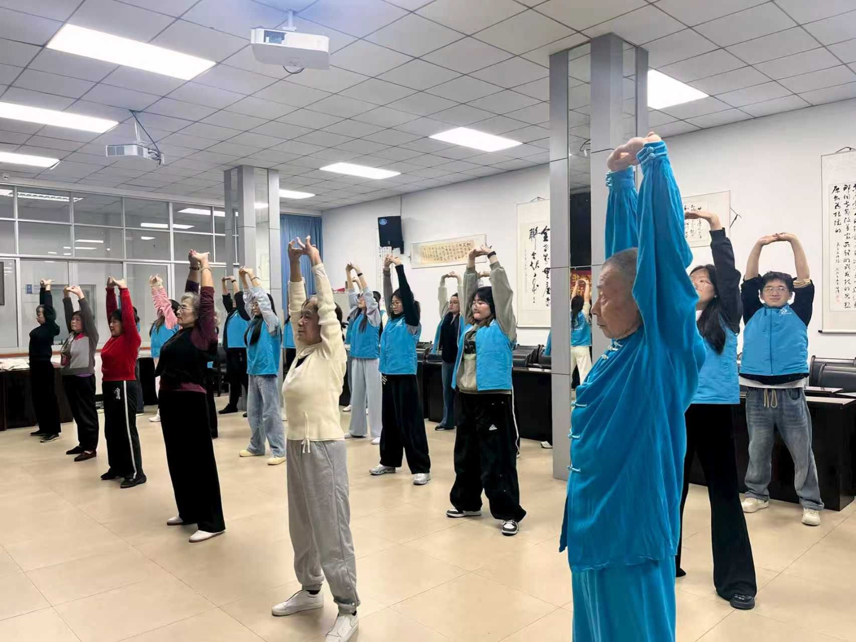 场地布置得很简单,音响一开,大家就动起来了。三位志愿者陪一位老教师,手把手地教动作。有的老教授动作慢,学生就放慢节奏跟着;有的记不住顺序,学生就一遍遍带。练到“摇头摆尾”那节,有位退休老师怎么也转不过来,旁边的志愿者扶着她腰,比划了好几次才慢慢转过来,最后两人都笑了。
