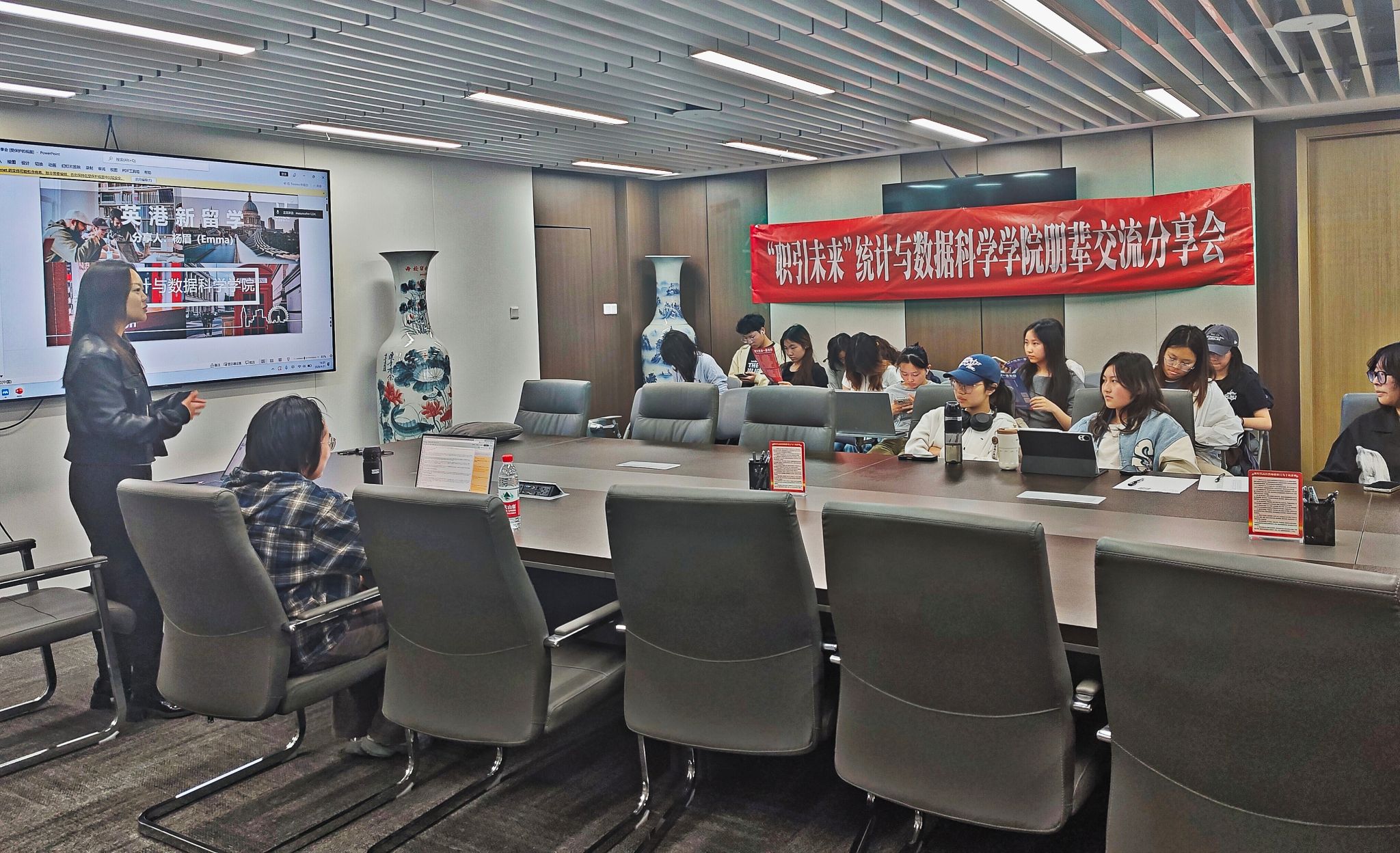 于诚正楼1320顺利举行“职引未来”朋辈交流会出国出境专场活动。本次活动特邀学院两位优秀学子与UKEC专业指导老师现场分享,共有40余名同学积极参加。